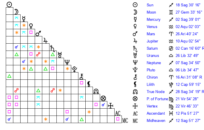 | Sun | 18 Sagittarius 30 | 18 Sagittarius 53 | 11 Aquarius 27 |