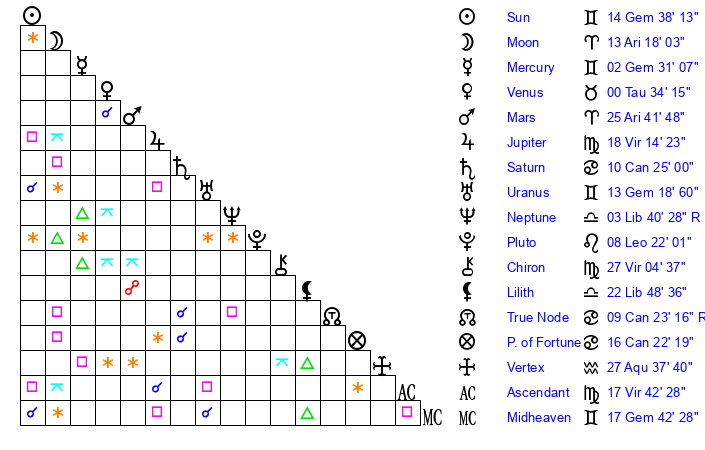 | Sun | 14 Gemini 39 | 15 Gemini 17 | 1 Virgo 9 |