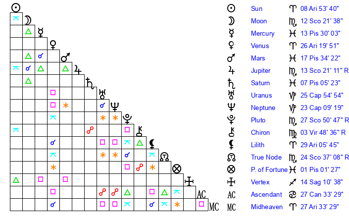 | Pluto | 27 Scorpio 50 | 3 Aquarius 31 | 27 Scorpio 10 |