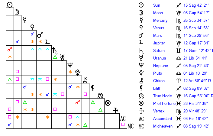 | Neptune | 5 Sagittarius 22 | 29 Pisces 22 | 7 Sagittarius 0 |