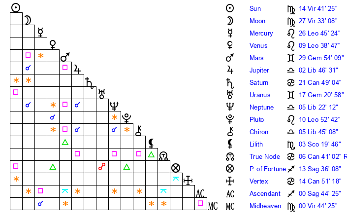 | Moon | 27 Virgo 31 | 14 Pisces 39 | 5 Virgo 48 |