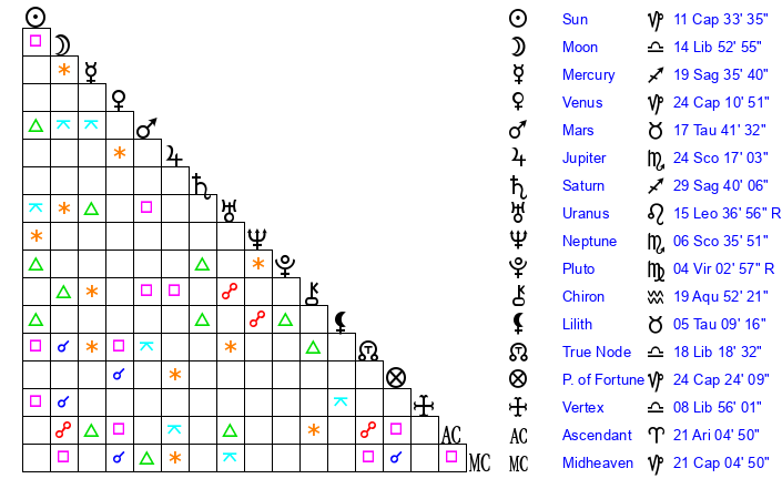 | Moon | 14 Libra 54 | 17 Aquarius 5 | 21 Pisces 10 |