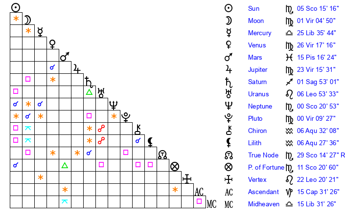 | Neptune | 0 Scorpio 21 | 29 Pisces 51 | 2 Scorpio 22 |