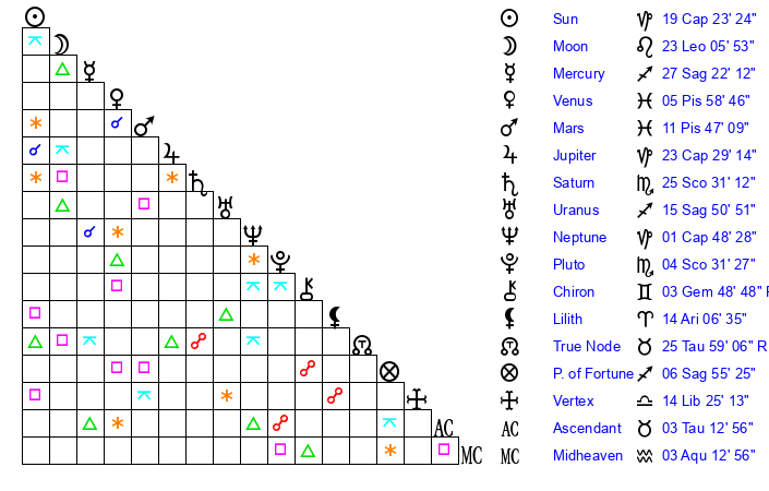 | Moon | 22 Leo 57 | 25 Taurus 21 | 17 Aquarius 34 |