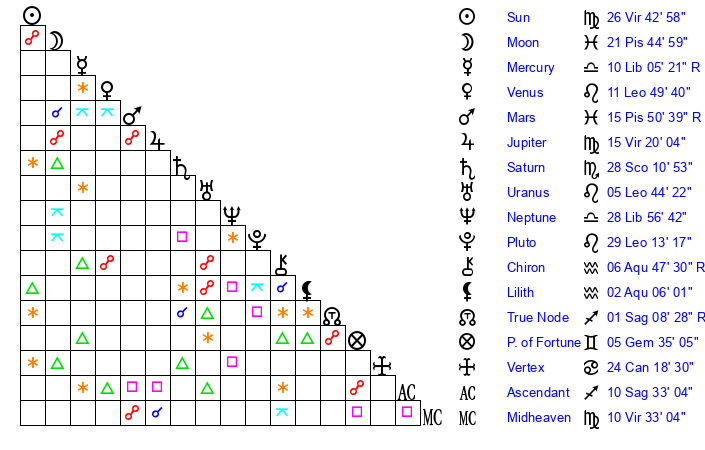 | Sun | 26 Virgo 43 | 27 Virgo 0 | 5 Sagittarius 26 |