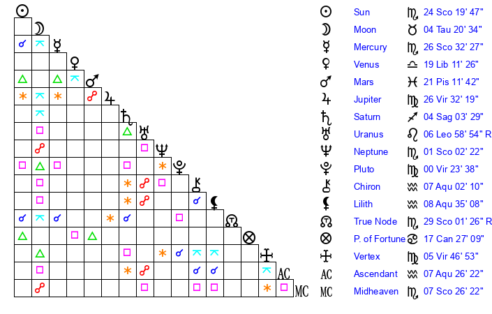 | Sun | 24 Scorpio 19 | 24 Scorpio 35 | 4 Aquarius 27 |