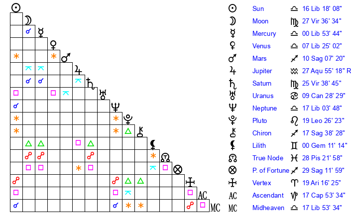 | Saturn | 26 Virgo 7 | 26 Pisces 58 | 2 Libra 33 |