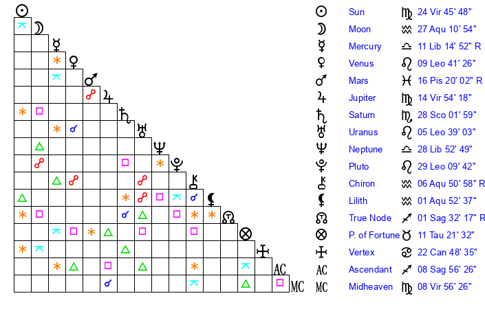 | Moon | 27 Aquarius 14 | 6 Leo 20 | 11 Virgo 53 |
