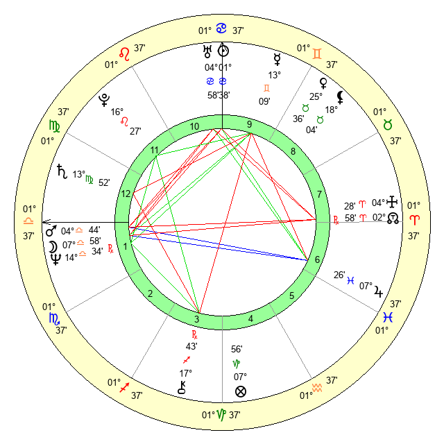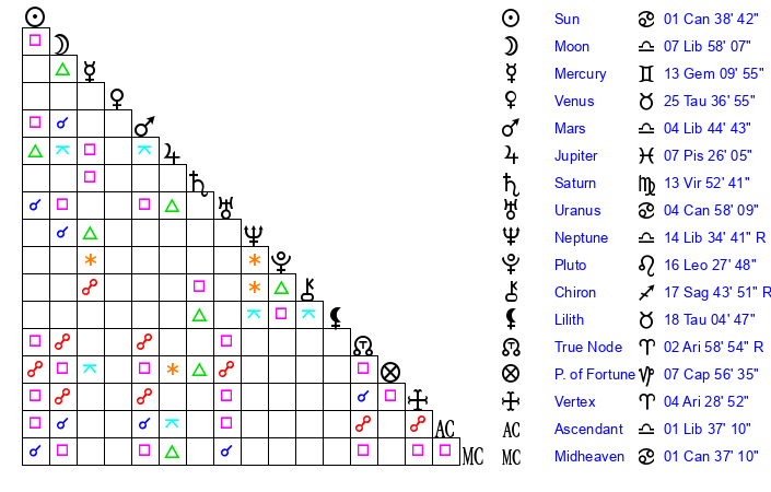 | Moon | 7 Libra 59 | 8 Gemini 40 | 7 Cancer 6 |