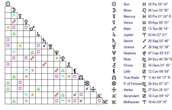 | Venus | 9 Aquarius 51 | 8 Aries 54 | 25 Pisces 14 |