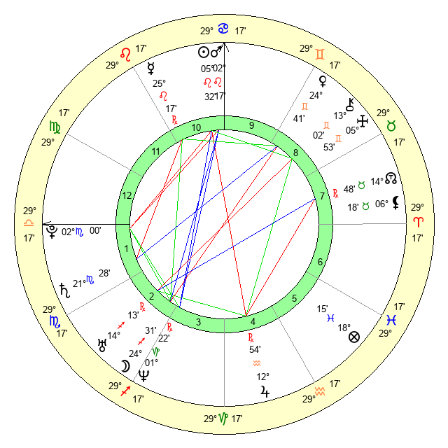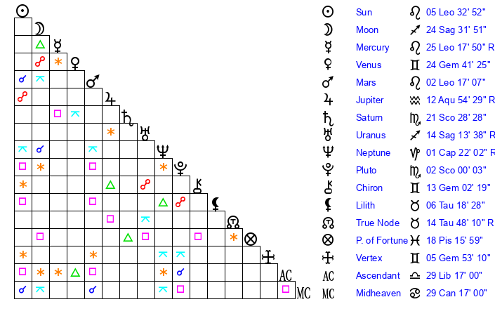 | Moon | 24 Sagittarius 30 | 23 Virgo 28 | 5 Gemini 8 |