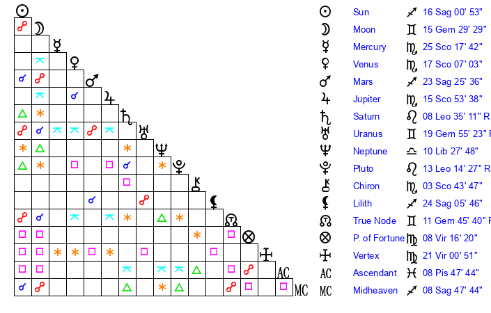 | Sun | 16 Sagittarius 1 | 16 Sagittarius 51 | 6 Pisces 15 |