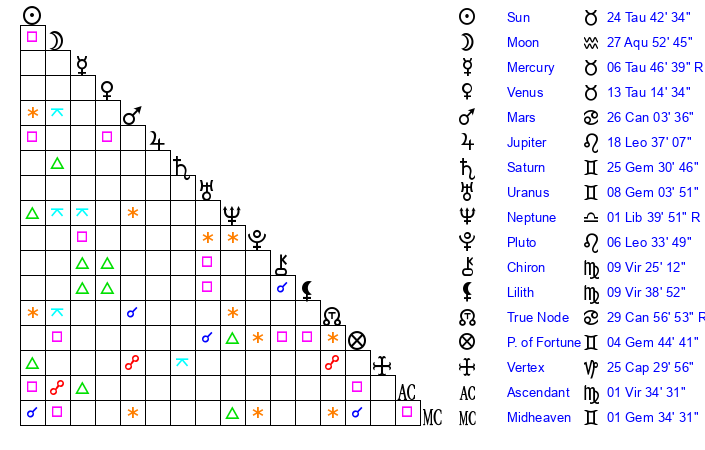 | Moon | 27 Aquarius 53 | 28 Sagittarius 30 | 14 Aquarius 37 |