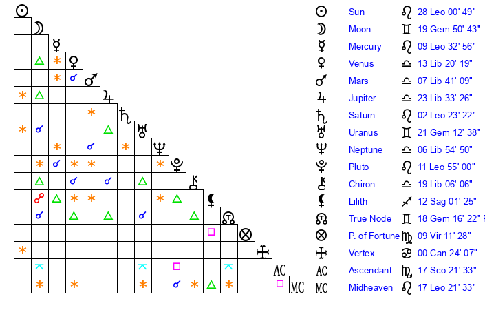 | Moon | 19 Gemini 45 | 9 Leo 47 | 7 Taurus 22 |