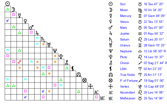 | Saturn | 29 Leo 51 | 28 Pisces 25 | 4 Virgo 59 |