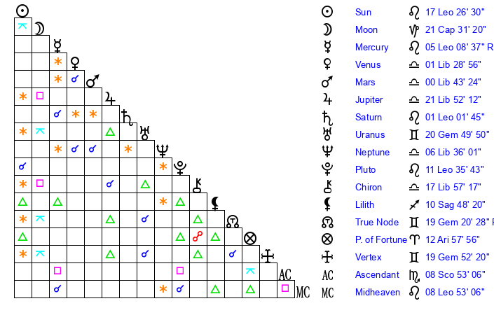 | Sun | 17 Leo 27 | 18 Leo 19 | 4 Scorpio 40 |