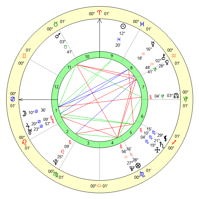 | Moon | 10 Cancer 43 | 3 Taurus 48 | 24 Capricorn 1 |