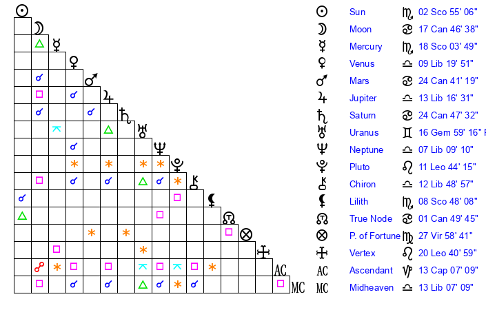| Sun | 2 Scorpio 55 | 3 Scorpio 32 | 23 Capricorn 57 |