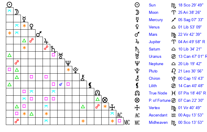 | Sun | 18 Scorpio 30 | 19 Scorpio 33 | 3 Aquarius 40 |