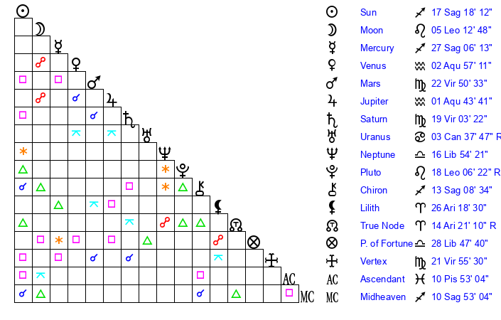 | Saturn | 19 Virgo 33 | 25 Pisces 11 | 17 Virgo 31 |