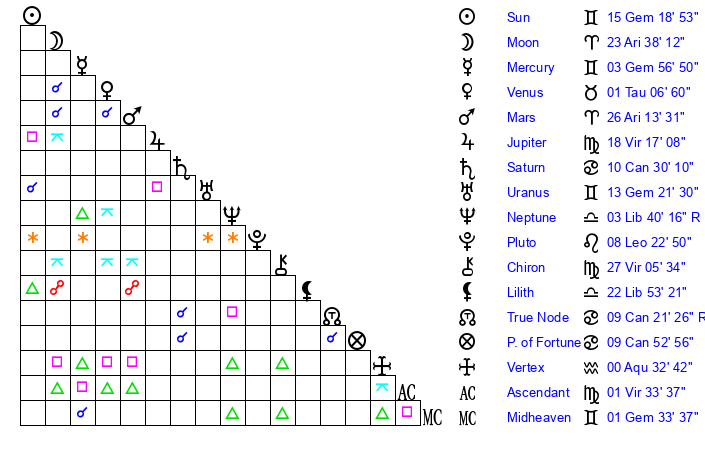 | Sun | 15 Gemini 19 | 15 Gemini 57 | 1 Virgo 50 |