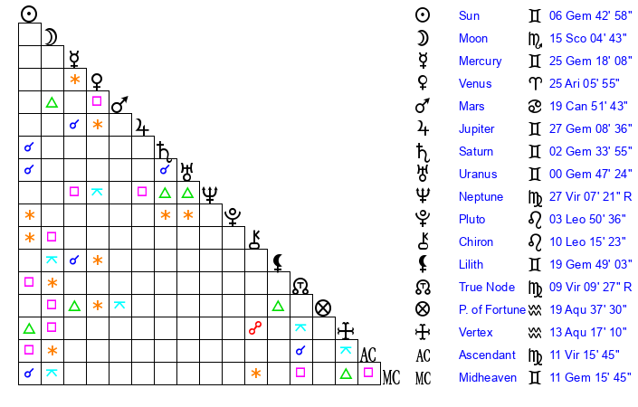 | Moon | 15 Scorpio 7 | 29 Gemini 42 | 29 Scorpio 1 |
