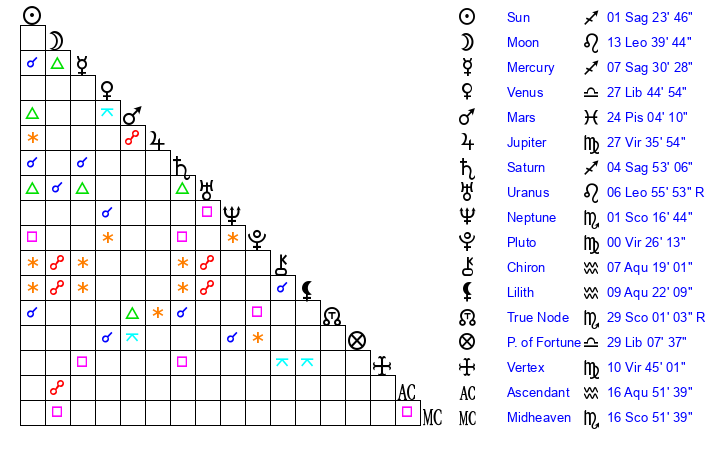 | Pluto | 0 Virgo 25 | 1 Aquarius 45 | 29 Leo 37 |