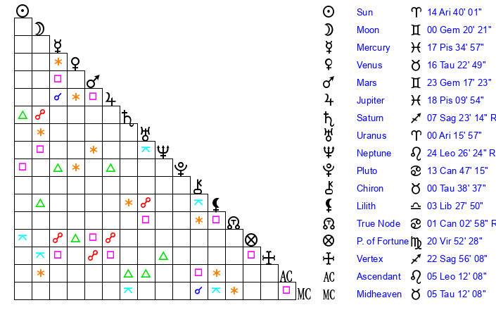 | Jupiter | 18 Pisces 7 | 16 Gemini 41 | 3 Aries 14 |