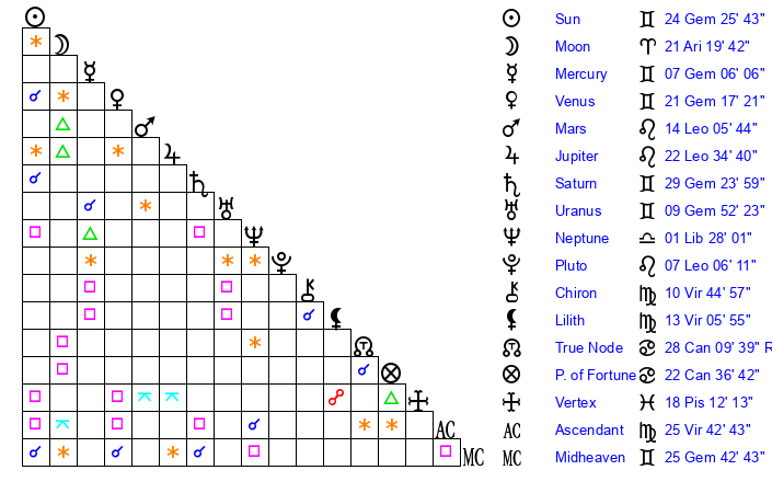 | Sun | 24 Gemini 26 | 24 Gemini 50 | 12 Virgo 1 |