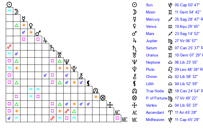 | Moon | 11 Gemini 57 | 5 Aries 7 | 1 Gemini 6 |