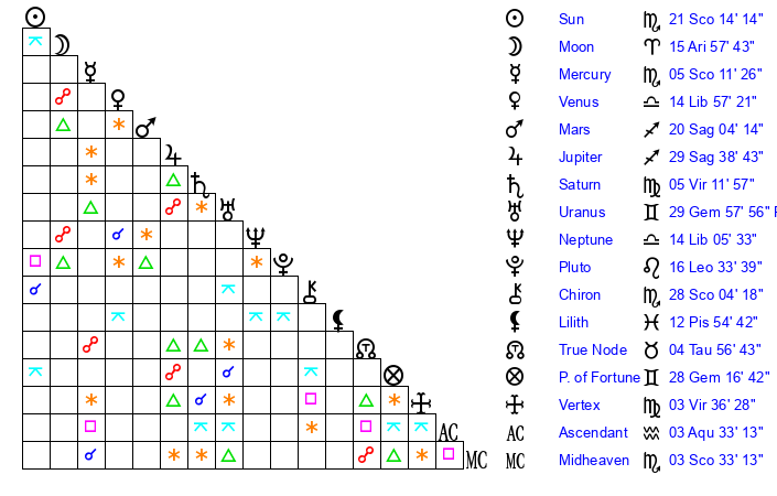 | Sun | 21 Scorpio 14 | 21 Scorpio 34 | 9 Aquarius 29 |