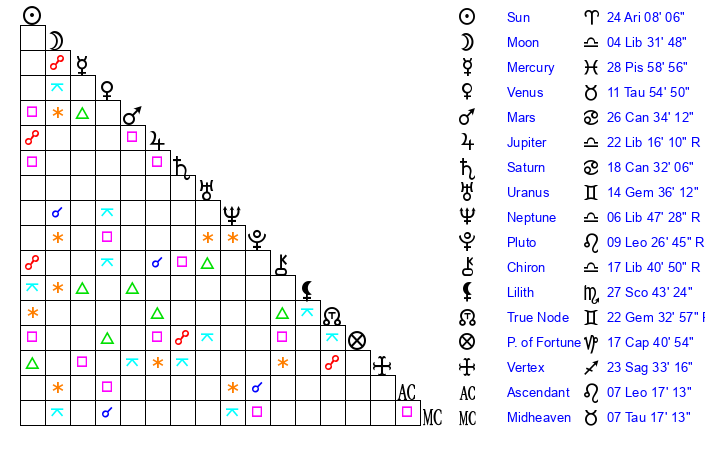 | Sun | 24 Aries 8 | 25 Aries 0 | 10 Cancer 11 |