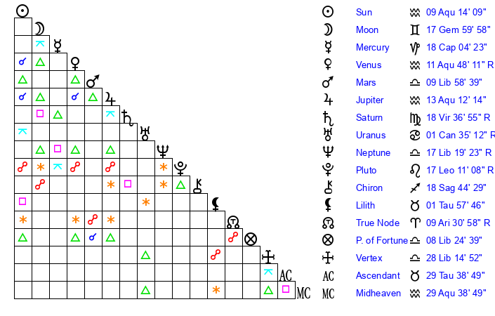 | Moon | 17 Gemini 55 | 12 Aquarius 20 | 25 Pisces 4 |