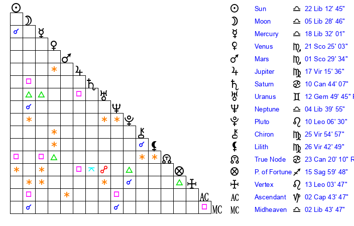 | Sun | 22 Libra 13 | 22 Libra 35 | 14 Capricorn 0 |