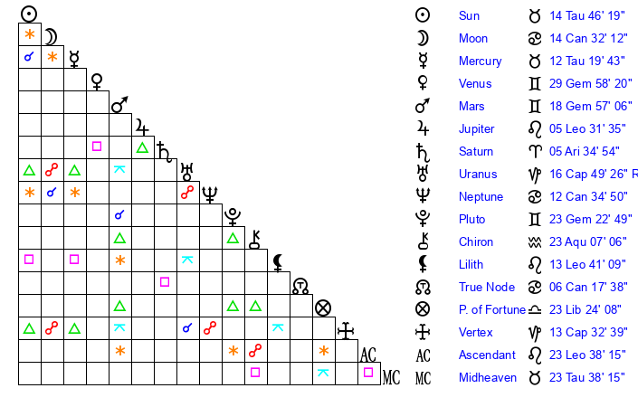 | Pluto | 23 Gemini 23 | 3 Aquarius 48 | 25 Gemini 43 |