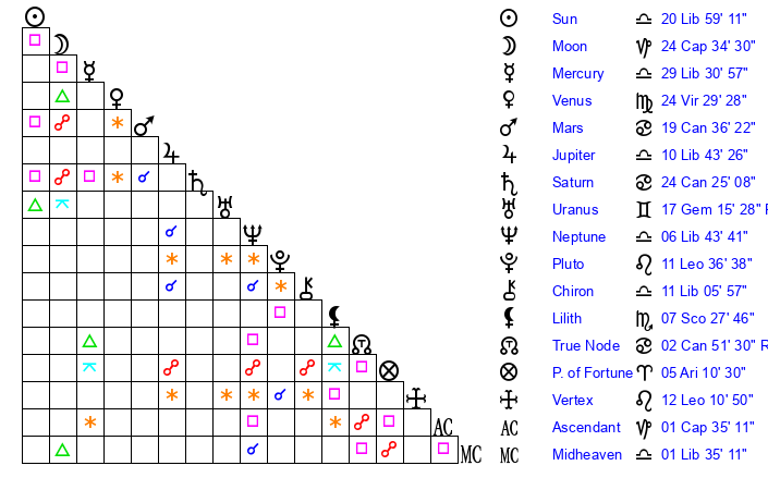 | Saturn | 24 Cancer 49 | 26 Pisces 40 | 22 Cancer 40 |
