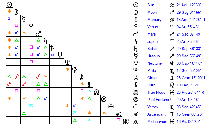 | Sun | 24 Aquarius 13 | 25 Aquarius 15 | 1 Aries 18 |