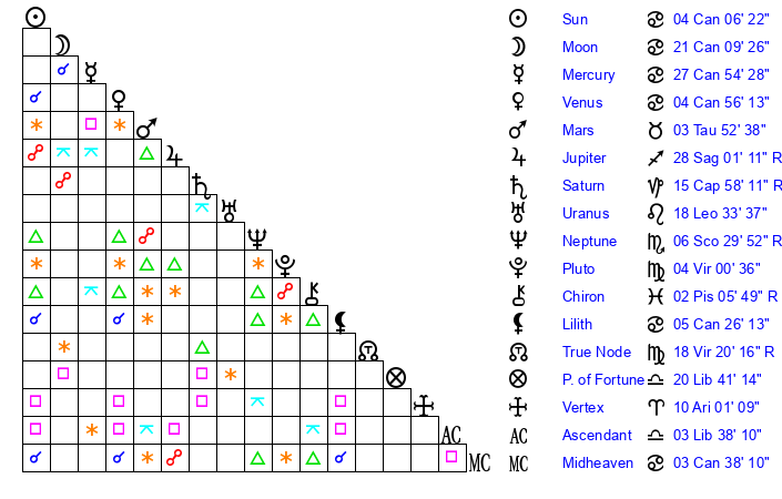 | Moon | 21 Cancer 12 | 8 Cancer 1 | 4 Sagittarius 59 |