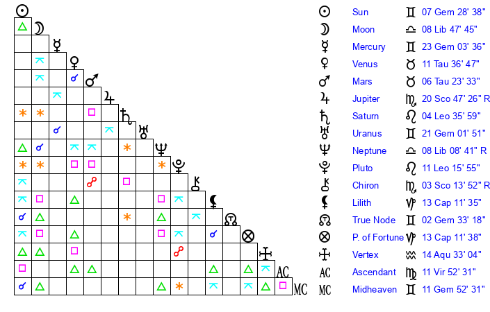 | Jupiter | 20 Scorpio 38 | 27 Gemini 29 | 18 Scorpio 58 |