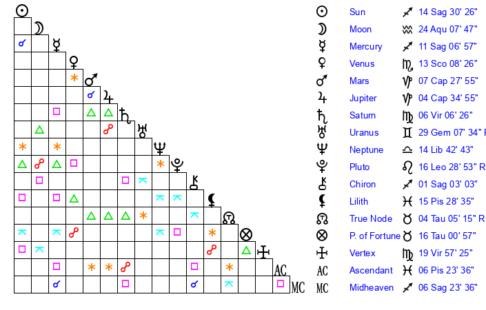 | Sun | 14 Sagittarius 30 | 14 Sagittarius 49 | 2 Pisces 45 |