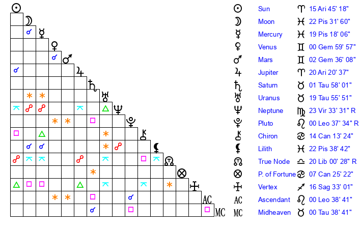 Moon | 22 Pisces 29 | 23 Cancer 47 | 28 Aries 56 |