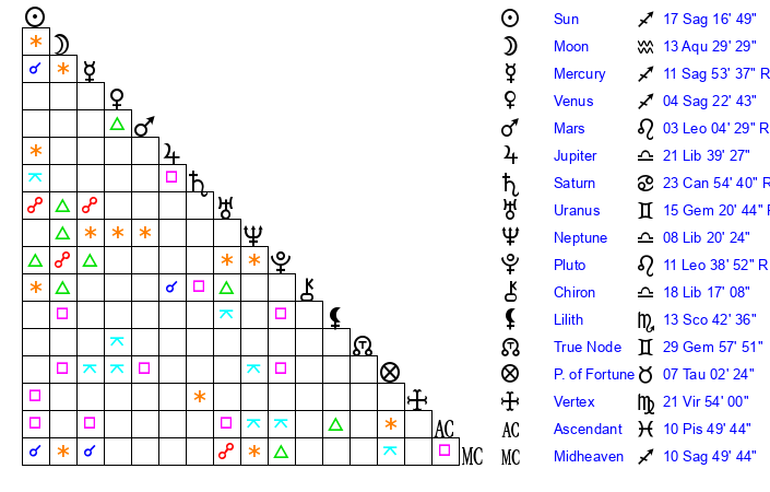 Jupiter | 21 Libra 31 | 15 Gemini 59 | 26 Libra 50 |