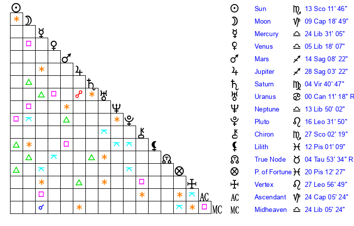 | Sun | 13 Scorpio 12 | 13 Scorpio 32 | 1 Aquarius 21 |