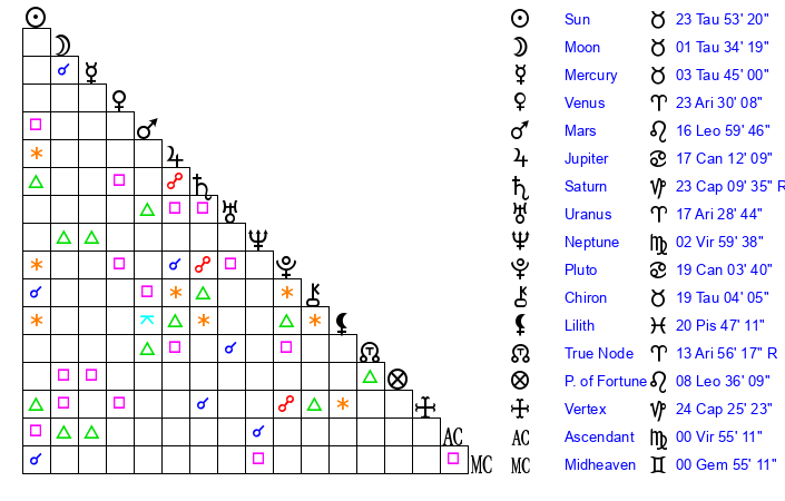 | Sun | 23 Taurus 53 | 25 Taurus 7 | 23 Leo 49 |
