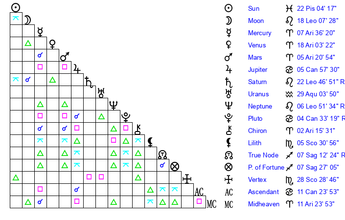 | Sun | 22 Pisces 4 | 23 Pisces 22 | 4 Cancer 58 |