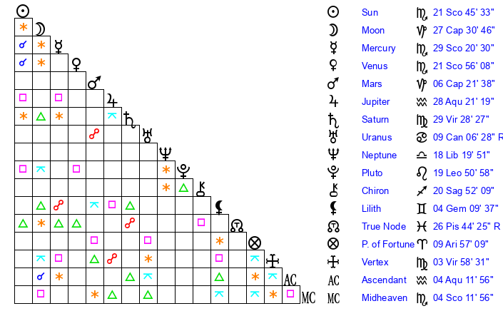 | Venus | 21 Scorpio 56 | 9 Scorpio 44 | 26 Aquarius 5 |