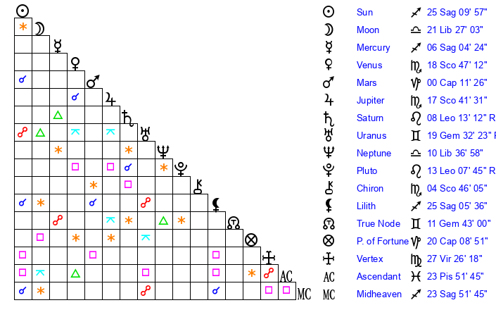 | Venus | 18 Scorpio 47 | 21 Sagittarius 13 | 1 Aquarius 43 |