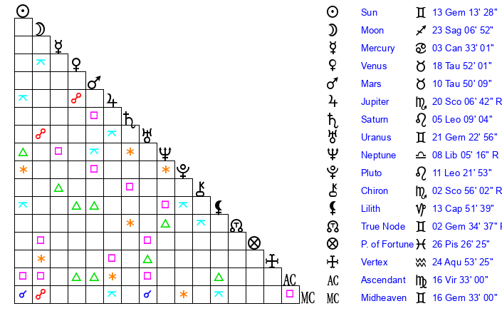 | Sun | 13 Gemini 13 | 14 Gemini 19 | 27 Leo 47 |