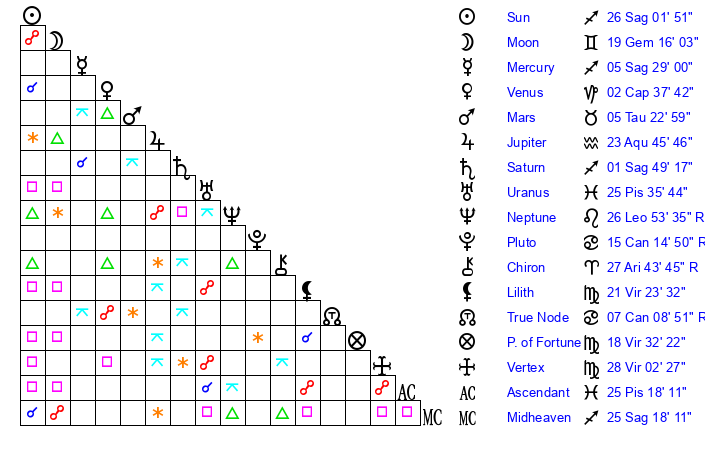| Moon | 19 Gemini 14 | 12 Sagittarius 4 | 21 Capricorn 2 |