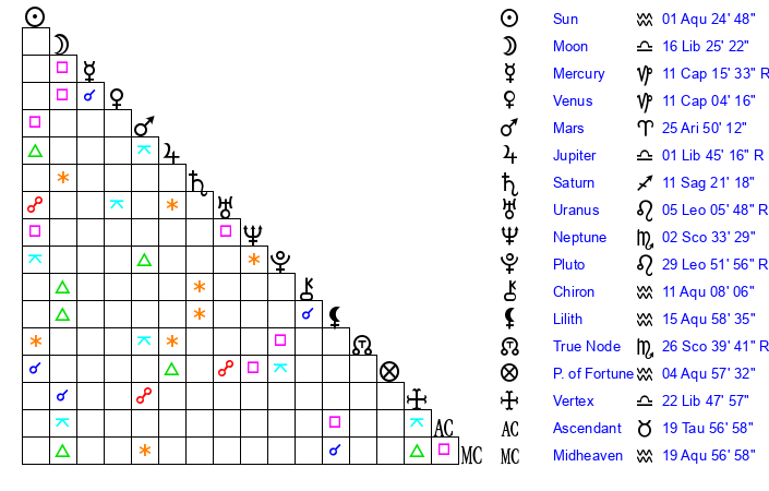 | Sun | 1 Aquarius 24 | 1 Aquarius 54 | 9 Aries 43 |